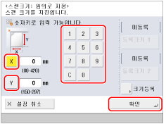 [X] 및 [Y]를 누르고 → 숫자 키를 사용하여 스캔 크기를 mm로 입력하고 → [확인]을 누릅니다.