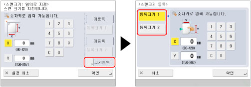 [X] 및 [Y]를 누르고 → 스캔 크기를 mm로 입력하고 → [확인]을 누릅니다.