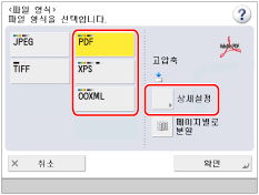 PDF 또는 XPS를 파일 형식으로 선택하는 경우 [고압축]과 [OCR (문자인식)]을 동시에 설정할 수 있습니다. 이 경우 [PDF (고압축)] 또는 [XPS (고압축)]가 '스캔하여 송신 기본 기능' 화면에서 파일 형식으로 표시됩니다.