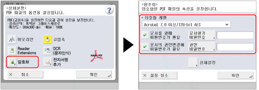이 모드를 사용하면 보안 강화를 위해 이메일 주소 또는 파일 서버로 송신하는 PDF 파일을 암호화할 수 있습니다.