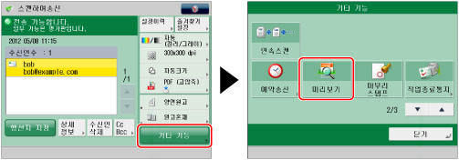 수신인을 지정하고 → [기타 기능]을 누른 다음 → [미리보기]를 누릅니다.