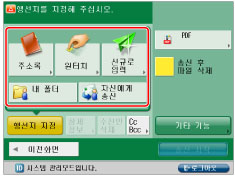[신규 수신인 제한]에서 수신인 종류를 '설정'으로 지정하면 해당 종류의 신규 수신인을 입력할 수 있습니다. 로컬 주소록, 리모트 주소록 또는 [주소록]에 LDAP를 사용하거나 [원터치]에 원터치 버튼을 눌러 저장된 수신인을 선택합니다. (See "송신 기능 제한.")