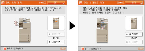 스테이플 걸림이 발생한 경우, 스테이플 걸림 위치와 걸림을 제거하는 방법에 대한 지침이 터치 패널 화면에 나타납니다. 스테이플 걸림을 제거하려면 화면의 지침을 따르십시오. 스테이플 걸림이 해결될 때까지 반복적으로 화면이 표시됩니다. [닫기]를 누르면 걸린 스테이플을 즉시 제거하지 않더라도 모드 설정 및 원고 스캔 등과 같은 조작을 계속 수행할 수 있습니다.