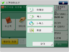 메인 메뉴 화면에 팩스 기능을 표시하도록 기기를 설정할 수 있습니다. 메인 메뉴 화면에 팩스 기능을 표시하려면 [스캔하여 송신]에서 팩스 기능을 표시할지 여부를 선택할 수 있습니다. [스캔하여 송신]에서 팩스 기능을 표시하여 이메일이나 I-팩스와 같은 다양한 송신 방법을 통해 여러 수신인에게 송신할 수 있습니다.
