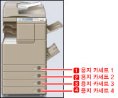 "컬러 선택에 의한 용지 카세트 자동 선택 지정"(컬러/흑백)에서와 동일한 크기, 종류 및 색상의 용지가 있는 들어 있는 급지 위치가 있는 경우 기기는 해당 급지 위치에서 자동으로 급지하고 인쇄를 계속합니다.