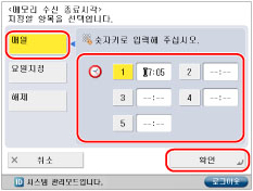 (숫자 키)를 사용하여 종료 시간을 입력하고 → [확인]을 누릅니다.|