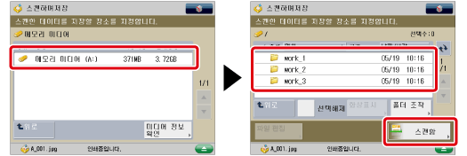 메모리 미디어를 선택하고 → 대상 폴더를 선택한 후 → [스캔함]을 누릅니다.