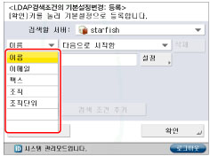 LDAP 서버에서 수신인을 검색하는 데 사용되는 자주 사용하는 검색 조건을 등록하는 경우 등록한 검색 조건이 기본적으로 검색 화면에 표시됩니다.