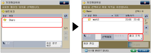 원하는 저장 위치를 선택하고 → 원하는 폴더 수준을 선택한 다음 → [폴더 조작]을 누릅니다.