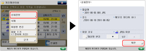 메모리 미디어에 들어 있는 파일에 대한 상세 정보(파일 이름, 위치, 수정 날짜 등)를 확인하고 파일을 추가하거나 삭제할 수 있습니다.
