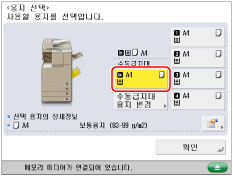 기기에 미리 해당 정보를 저장한 경우 각 용지 카세트에 넣은 용지 종류를 나타내는 아이콘을 용지 선택 화면에 나타나도록 할 수 있습니다. (See "사용자 설정 용지 종류 등록/편집.")