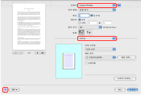 [프린터]에서 프린터를 선택하고 → 환경 설정 창을 선택한 후 → [