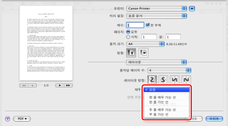 각 페이지에 테두리를 추가하려면 [테두리]에서 선 종류를 선택합니다.