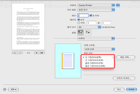 [제본 위치]에서 제본 가장자리를 선택합니다.
