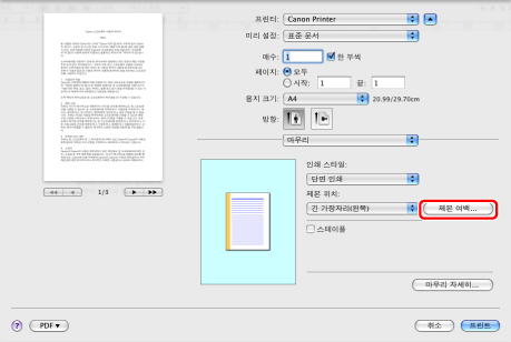 중앙여백 폭을 설정하려면 [제본 여백]을 클릭합니다.