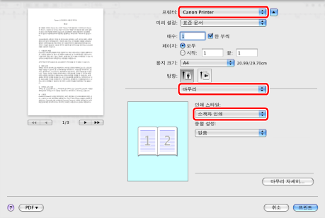 프린터를 선택하고 → [마무리] → [인쇄 스타일]에서 [소책자 인쇄]를 선택합니다.