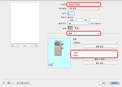사용 중인 프린터를 선택하고 → [품질]을 선택한 다음 → [컬러 모드]에서 [흑백] 또는 [컬러]를 선택합니다.