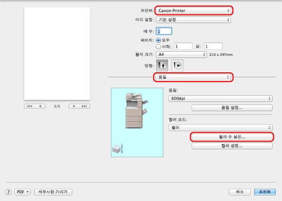 사용 중인 프린터를 선택하고 → [품질]을 선택한 다음 → [컬러 수 설정]을 클릭합니다.