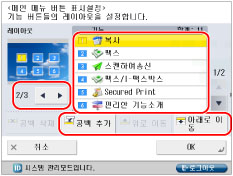기능 버튼 수가 <메인 메뉴 버튼표시 설정>에 대해 지정된 레이아웃의 버튼 수를 초과할 경우 버튼 수를 초과하는 나머지 버튼이 메인 메뉴 화면의 2페이지 뒤에 표시됩니다. 최대 9개 버튼을 메인 메뉴 화면에 표시할 수 있습니다.