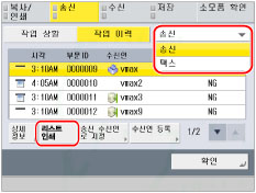 팩스 통신관리 리포트에 대한 송신 이력을 인쇄하려면 드롭다운 리스트에서 [팩스]를 선택합니다. (See "팩스통신관리 리포트.")