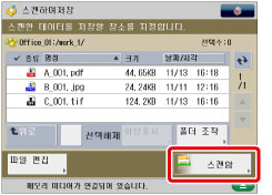 파일이 올바르게 저장되었는지 확인하려면 [상황확인/중지] → [저장] → [작업 이력]을 누릅니다. 결과가 “NG”로 표시될 경우, [상세정보]를 눌러 에러 코드를 확인합니다. 각 에러 코드에 대한 원인 및 해결 방법에 대한 자세한 내용은 "메시지가 없는 에러 코드 리스트."를 참고하십시오.