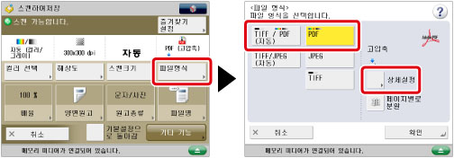 PDF 파일 형식으로 [고압축]을 선택한 경우 컬러 모드는 [자동 (컬러/흑백)] 및 [흑백2치]에서 [자동(컬러/그레이)] 및 [그레이스케일]로 변경됩니다. 지정하는 컬러 모드로 문서를 스캔하려는 경우 PDF 또는 XPS 파일 형식을 [고압축] 또는 [아웃라인] 이외의 형식으로 변경합니다.