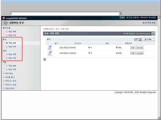 전송작업 상황 화면에서 전송된 작업의 상세 정보를 확인할 수 있습니다. 전송 작업에 대한 자세한 내용은 "팩스 송/수신."을 참고하십시오.