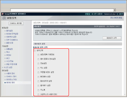 모두 가져오기를 사용할 때 부문별 ID 관리 설정이 포함된 경우 시스템 관리자 설정(예: ID 및 비밀번호)을 덮어쓰게 됩니다. 모두 가져오기를 사용한 후 로그인할 때 내보내는 기기의 시스템 관리자 설정이 필요합니다. 모두 내보내기를 사용하기 전에 이 정보를 확인해야 합니다.