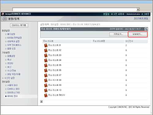 [설정/등록] → [수신인 설정] → [주소록 내보내기 설정] → [주소록을 내보내기할 때 비밀번호 포함]가 선택됩니다.