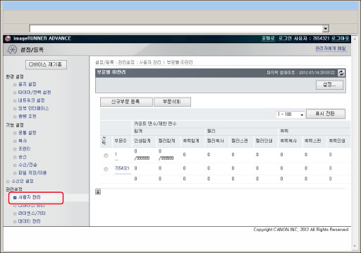 이 설정을 사용하면 [스캔하여 저장], [저장파일 이용], [팩스/I-팩스 박스], [스캔하여 송신], [팩스] 및 [리모트 스캐너] 기능에 대해 부문별 ID 관리를 설정할 수 있습니다. 사용자 인증을 사용 중인 경우, 기능 제한 모드를 사용할 수 없습니다.