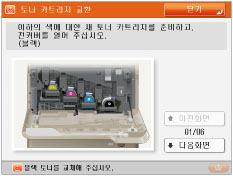 터치 패널 화면에서 [이전화면] 또는 [다음화면]을 눌러 토너 카트리지 교체 방법에 대한 자세한 설명을 볼 수 있습니다.