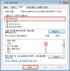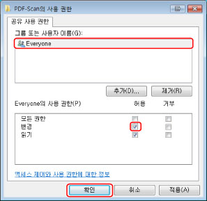 Windows XP의 경우 [Everyone]를 선택하고 → <수정>에 대해 [허용]을 선택한 다음 → [확인]을 클릭합니다. Windows Vista의 경우 [Everyone]를 선택하고 → <수정>에 대해 [허용]을 선택한 다음 → [닫기]를 클릭합니다.