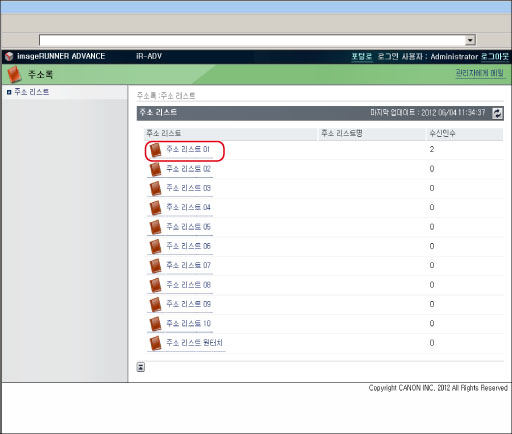 [주소록]을 클릭하고 → 주소 리스트 화면에서 [주소 리스트 01]을 선택합니다.
