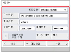 \\Computer Name\PDF-Scan. Windows를 사용하는 경우 컴퓨터 이름으로 "공유 폴더 생성(Windows)"의 1단계에서 만든 컴퓨터 이름을 입력합니다. Macintosh를 사용하는 경우에는 "공유 폴더 생성(Mac)"의 2단계에서 확인한 컴퓨터 이름을 입력합니다.
