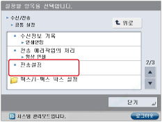 (설정/등록) → [기능 설정] → [수신/전송] → [공통 설정] → [전송 설정]을 누릅니다.