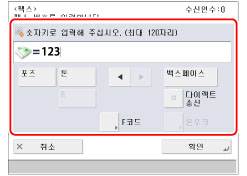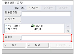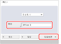 [전송처]를 누르고 → 2단계에서 사무실 B에 대해 등록한 팩스 번호를 주소록에서 선택한 후 → [확인] → [다음화면]을 누릅니다.