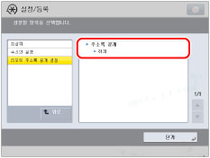 (설정/등록) → [수신인 설정] → [리모트 주소록 공개 설정] → [주소록 공개]를 누릅니다.
