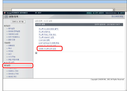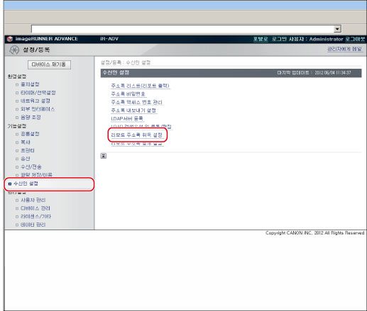리모트 UI에 액세스하고 → [설정/등록] → [수신인 설정] → [리모트 주소록 취득 설정]을 클릭합니다.