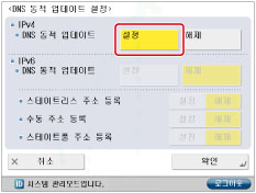 (설정/등록) → [환경 설정] → [네트워크] → [TCP/IP 설정] → [DNS 설정] → [DNS 서버 주소 설정]을 누릅니다.