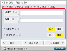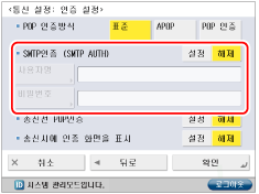 이메일 서버의 환경에서 SMTP 인증을 필요로 하는 경우 이 설정을 '설정'으로 지정하고 사용자명 및 비밀번호를 입력합니다.