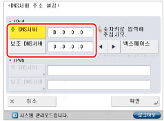 (설정/등록) → [환경 설정] → [네트워크] → [TCP/IP 설정] → [DNS 설정] → [DNS 서버 주소 설정]을 누릅니다.