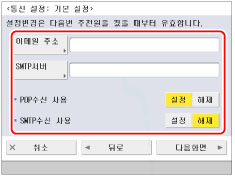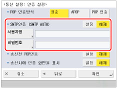 이메일 서버의 환경에서 SMTP 인증을 필요로 하는 경우 이 설정을 '설정'으로 지정하고 사용자 이름 및 비밀번호를 입력합니다.