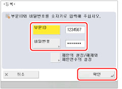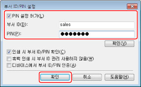 [확인]을 클릭하여 프린터에 연결해서 등록한 부문 ID 및 비밀번호가 올바른지 여부를 확인합니다.