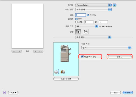 [특수 기능] 패널에서 [작업 어카운팅]을 선택하고 → [설정]을 클릭합니다.