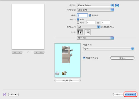 사용할 프린터를 선택하고 → [특수 기능] 패널을 선택합니다.