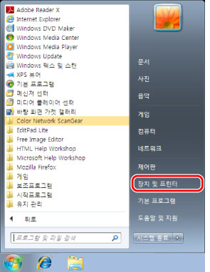 ](시작) → [장치 및 프린터]를 클릭합니다.