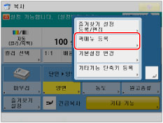 퀵 메뉴에 복사, 스캔하여 송신 및 스캔하여 저장 등 자주 사용하는 설정을 등록하면 다른 기기에서도 이러한 등록된 설정을 사용할 수 있습니다.