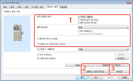 기기에 장착된 프린터 옵션(용지 급지 방법, 용지 출력 옵션 등)을 설정할 수 있습니다.