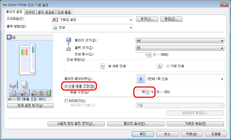 사용 중인 프린터 모델에 따라 선택한 페이지 크기에 대한 최적 배율로 문서를 확대하지 못할 수도 있습니다.