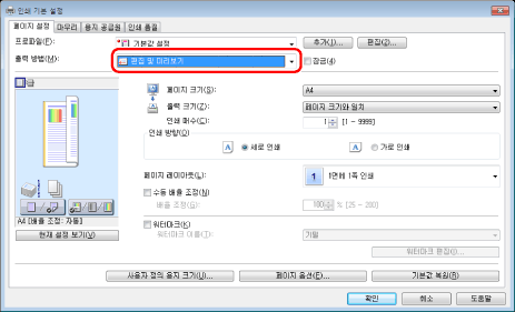 [출력 방법]에서 [편집 및 미리보기]를 선택합니다.